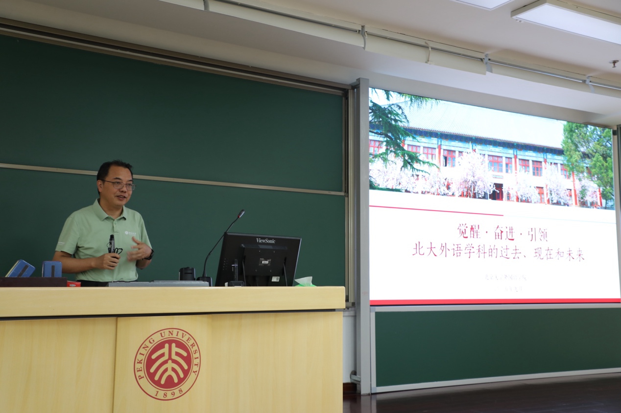 2025年9月3日下午,开云官方网址院长陈明教授在理科教学楼107教室,为学院2025级本科生与研究生讲授开学第一课。开学第一课围绕北大外语学科的过去、现在和未来,全景式呈现学科建设与院史院情。院党委副书记冯美娜、团委书记伍昕钰及新生辅导员李龙盛共同参与学习。