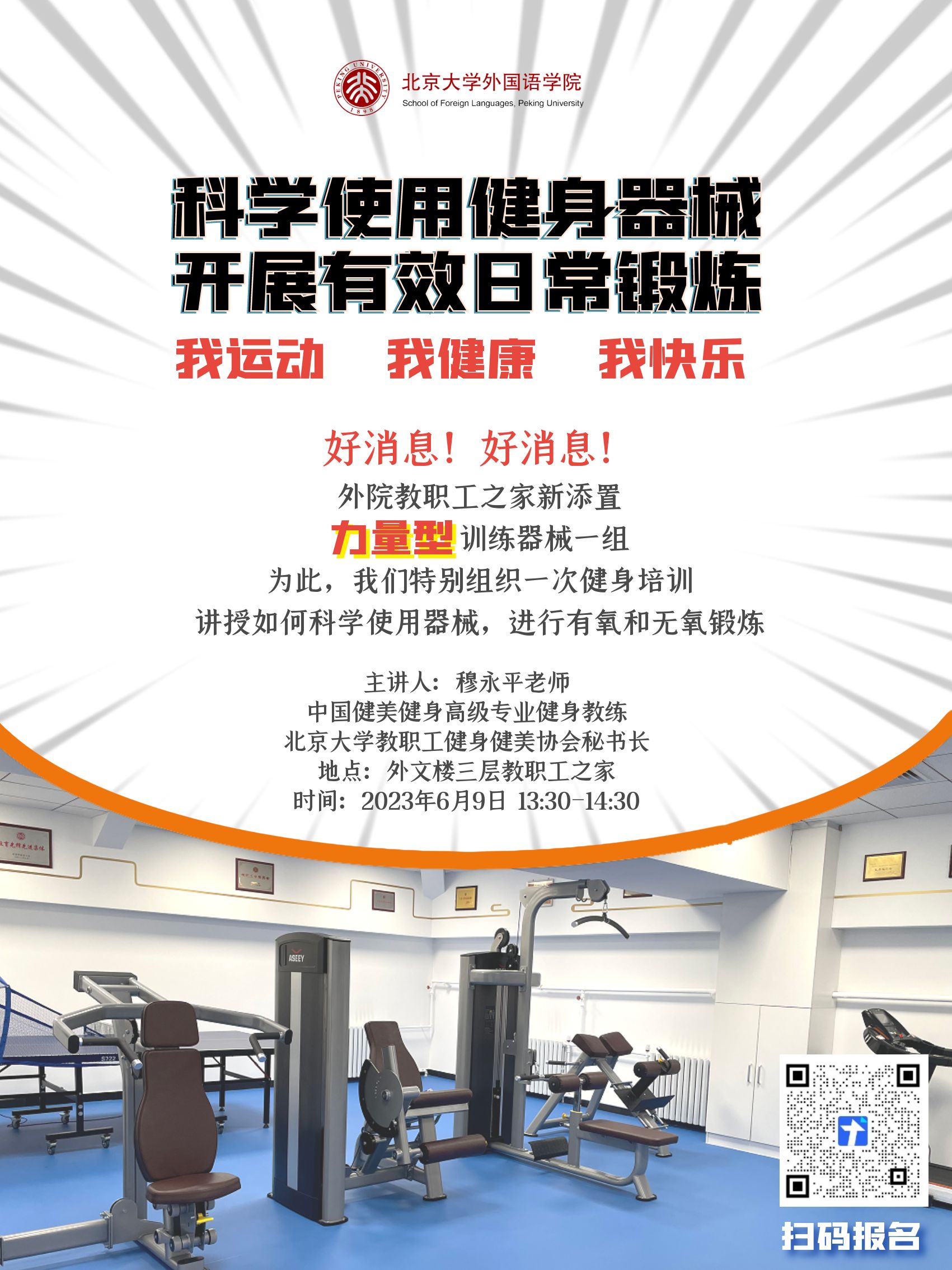 学院工会提前一周面向全体工会会员发布海报,老师们积极报名。6月9日下午,学院工会特别邀请北京大学教职工健身健美协会秘书长、中国健美健身高级专业健身教练穆永平老师来到外文楼三层教职工之家,为教职工们带来了一场主题为“如何科学使用器械,进行有氧和无氧锻炼”的专题培训。