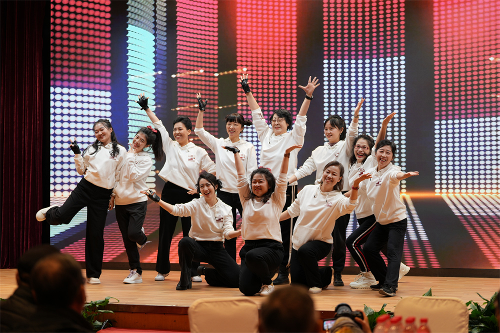 振奋人心的大事记过后,外院工会舞蹈队的老师们带来开场舞蹈《快乐崇拜》。不同于以往,今年老师们首次挑战街舞,让大家眼前一亮。表演团队更是横跨60后、70后、80后、90后、00后,向大家传递自信与快乐,现场气氛瞬间被点燃。