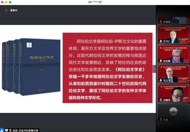 仲跻昆夫人刘光敏代表于2020年4月去世的仲跻昆发表了感言。她表示,《阿拉伯文学史》是仲跻昆教授近20部著作和译作当中最为重要的一部。她讲述了仲跻昆教授生前热爱诗歌、热爱朗诵、热爱翻译、热爱学术研究的点滴,并朗诵了一首仲跻昆教授翻译的纪伯伦作品《花之歌》。
