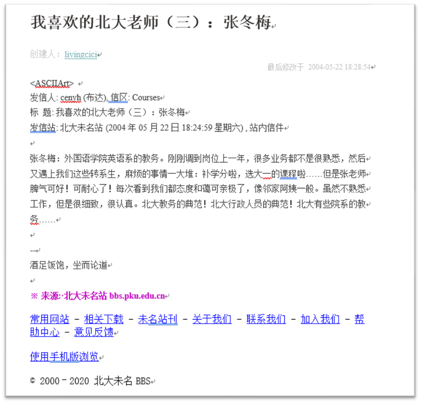 她以认真负责、热情真诚的服务态度,温暖了师生员工,赢得了师生的一致好评。一位因不适应本专业学习受到张冬梅老师帮助解决的同学给张老师的卡片上写到:感谢老师,我永远是外院的孩子。2004年北京大学未名BBS曾评选“我喜欢的北大老师”,张冬梅老师榜上有名,被学生称赞为“和蔼可亲的邻家阿姨”。