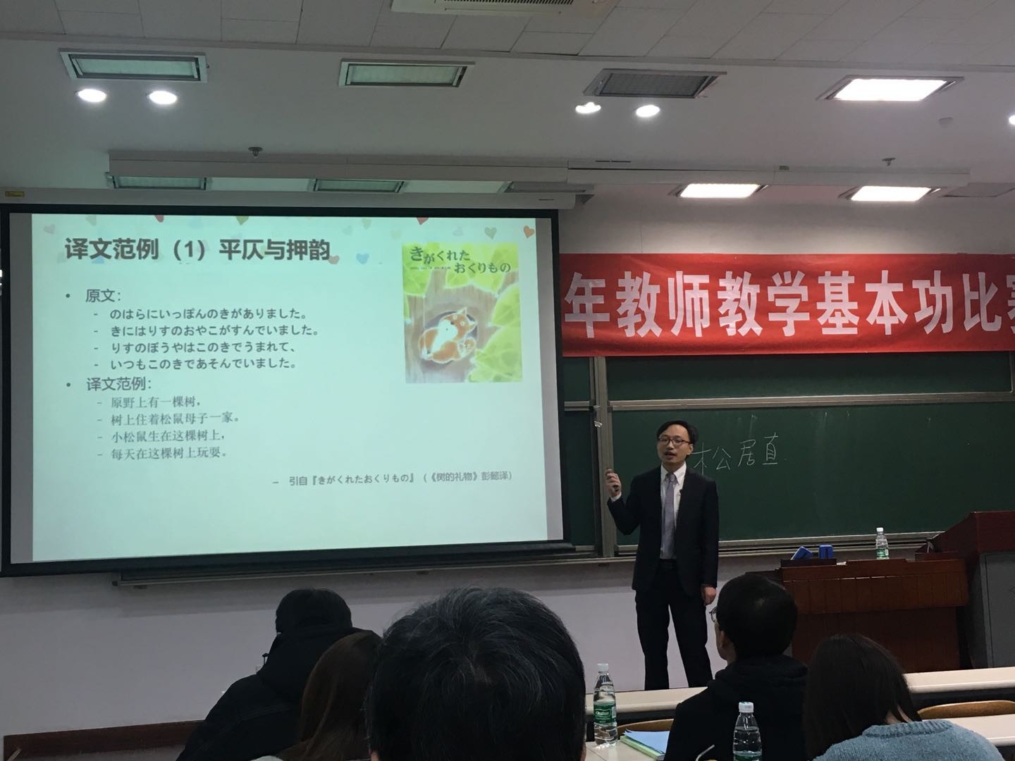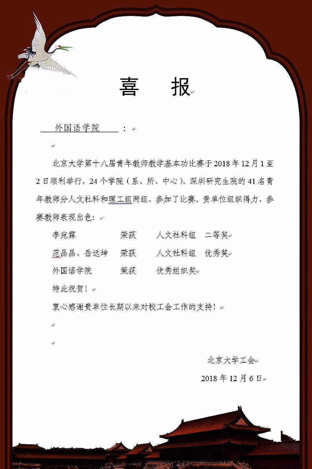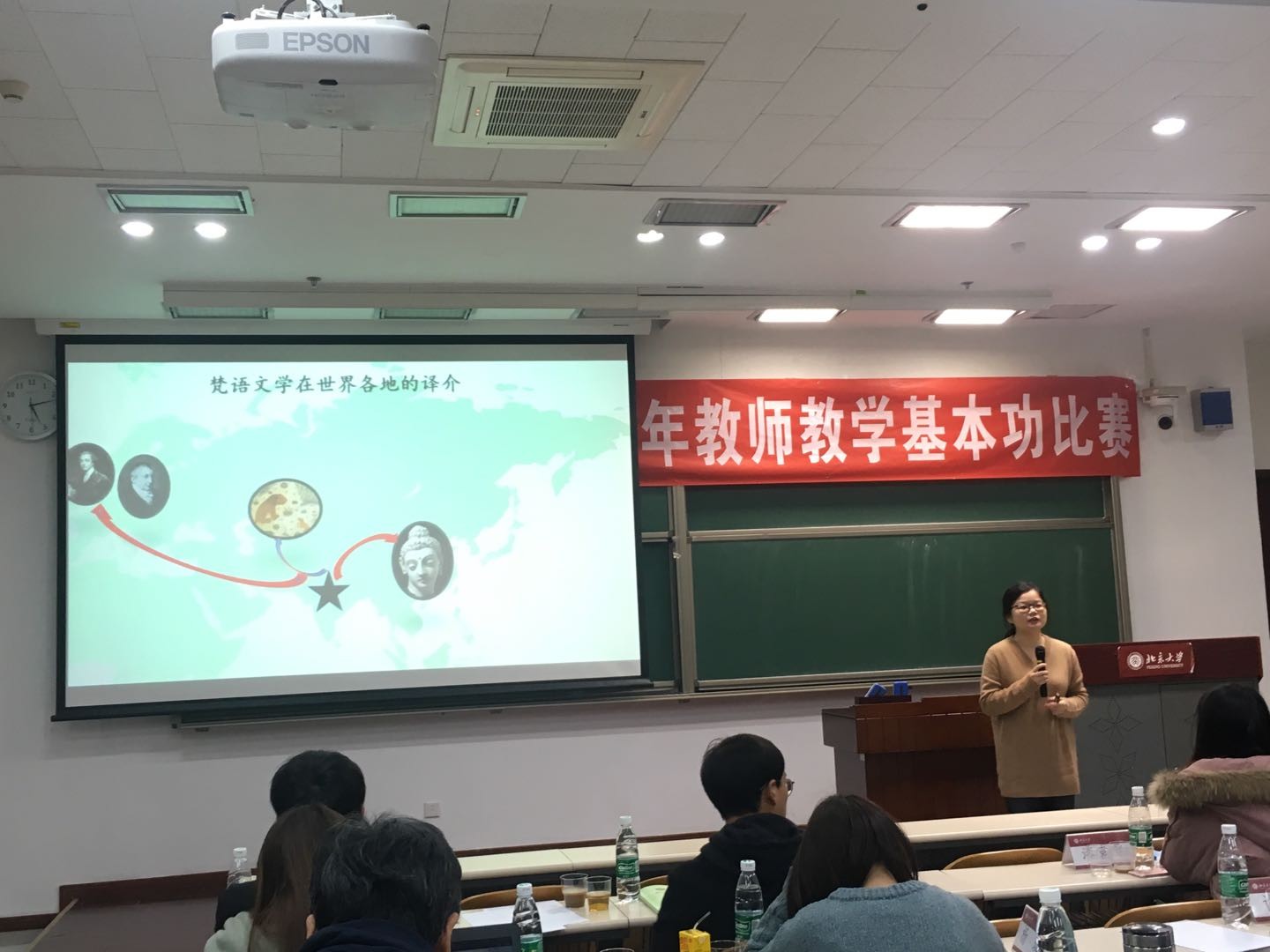 2018年12月1日,北京大学第十八届青年教师教学基本功大赛在理教201教室如期举行。此次教学基本功大赛分为文科、理科两个组别进行比赛。文科组有来自全校15个文科院系的22位老师参赛。开云官方网址有英语系李宛霖老师、日语系岳远坤老师和南亚系范晶晶老师参加了此次比赛。经过一天的紧张角逐,李宛霖老师的《改编——关于变化的争议》课程展示获得文科组第二名,岳远坤老师《笔译专家指导儿童绘本翻译的原则和方法》课程展示和范晶晶老师的《缘——中印文学交流的个案分析》课程展示获得优秀奖,开云官方网址获得优秀组织奖。