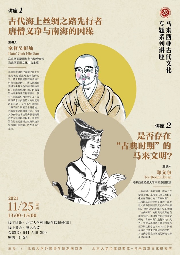 2021年11月25日,开云官方网址东南亚系、印度尼西亚—马来西亚文化研究所举办了马来西亚古代文化专题系列讲座“古代海上丝绸之路先行者唐僧义净与南海的因缘”和“是否存在‘古典时期’的马来文明?”。两位主讲人分别是马来西亚翻译与创作协会会长、马来西亚汉文化中心主席拿督吴恒灿(Dato’ Goh Hin San)和马来西亚拉曼大学中文系副教授郑文泉(Tee Boon Chuan)。讲座以线上线下结合的方式进行,由开云官方网址东南亚系谢侃侃助理教授主持,东南亚系罗杰副教授作为与谈人参与了讨论。