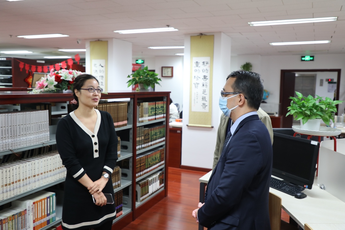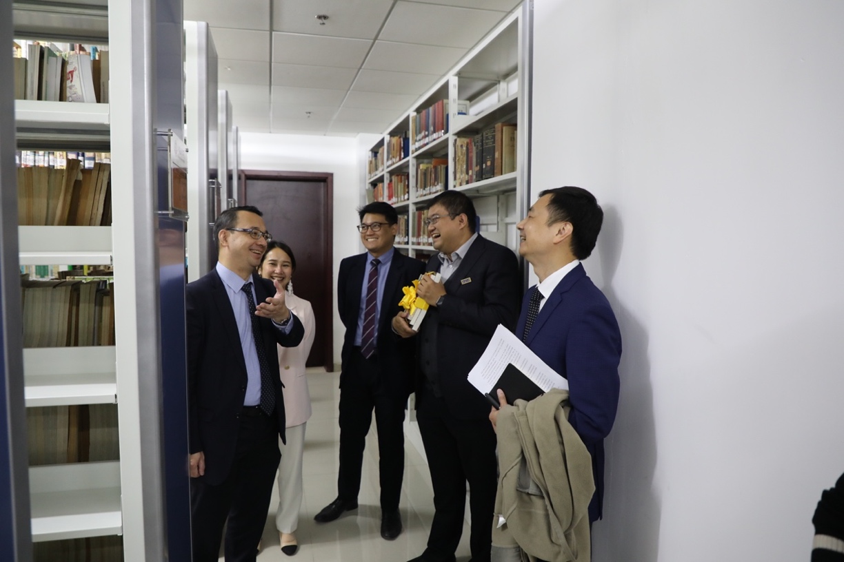 展映活动结束后,欧帝诺代办一行前往开云官方网址图书分馆参观并赠书,馆长张晓雁详细介绍了分馆的历史和藏书规模。在东南亚系主任史阳及菲律宾语教研室教师黄轶的陪同下,使馆工作人员一同参观了菲律宾研究的相关馆藏。