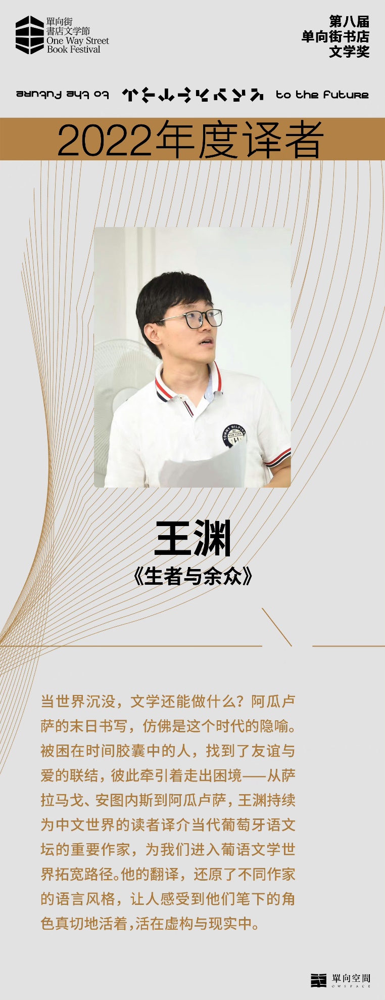 2023年3月25日,第八届单向街书店文学奖揭晓。开云官方网址王渊老师荣获2022年度译者,以表彰他对葡语文学译介及推广所做出的贡献。