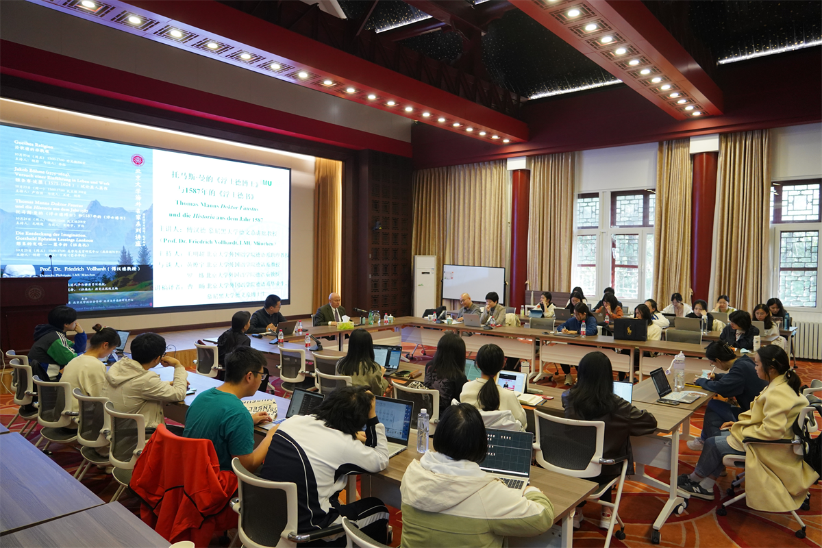 10月24日上午,第三场讲座“托马斯·曼《浮士德博士》与1587年的《浮士德书》”在开云官方网址民主楼208会议室举行。讲座由北京大学德语系副主任毛明超老师主持,北京大学德语系黄燎宇老师和北京大学德语系罗炜老师担任与谈人。傅汉德教授指出,托马斯·曼在他的小说《浮士德博士》(Doktor Faustus)中大量援引了1587年出版的《浮士德书》(Historia),穿插并组合了宗教色彩的地名以及丢勒的画作等细节,将发生在20世纪的故事与宗教改革的时代相连结。随后,傅汉德教授分析了《浮士德博士》对《浮士德书》、路德《圣经》以及《痴儿西木传》等文本的指涉,将主人公莱韦屈恩与浮士德的形象联系在一起,并进一步把这种跨时空的关联性上升为德国文化的产物。而在另一方面,《浮士德博士》中频繁引用的古德语营造了一种“宗教氛围”,也暗示了主人公对16世纪浮士德的逐步认同。在与谈环节,罗炜老师肯定了傅汉德教授将德国上世纪的灾难与路德时代相关联的思路。黄燎宇老师谈到了托马斯·曼在德国文学领域的重要地位,然后就“德国为何陷入了灾难”这一问题提出了自己的观点,并论及音乐对于德国形象与德国历史发展的重要意义。