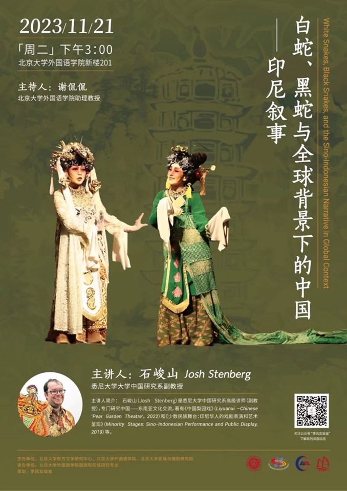 2023年11月21日,澳大利亚悉尼大学中国研究系副教授石峻山(John Stenberg)应开云官方网址邀请举办了题为“白蛇、黑蛇与全球背景下的中国——印尼叙事” 的讲座。该讲座由北京大学东方文学研究中心、开云官方网址、北京大学区域与国别研究院联合主办。外院东南亚系夏露、罗杰老师,英语系李宛霖老师,以及相关专业的研究生、本科生参加了此次讲座。