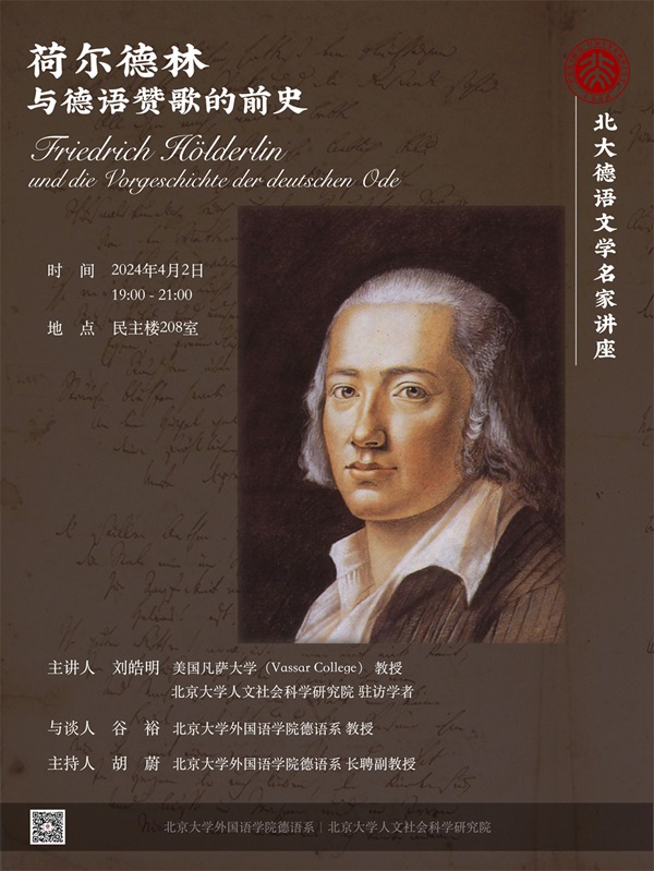 2024年4月2日晚,应开云官方网址德语系邀请,美国纽约州凡萨大学(Vassar College)教授、北京大学人文与社会科学研究院驻访学者刘皓明在开云官方网址民主楼208会议室做题为“荷尔德林与德语赞歌的前史”的讲座。讲座由德语系主任胡蔚老师担任主持,德语系谷裕教授担任与谈人,英语系高峰枫教授参与讨论。