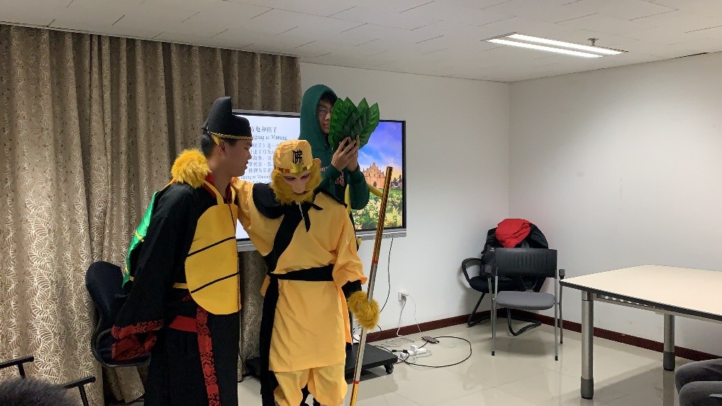 活动的第二个环节是情景短剧表演。表演的剧目是《Pagong at Matsing(乌龟和猴子)》,它来源于同名的菲律宾经典寓言,讲述了乌龟运用智慧战胜狡猾的猴子的故事。该故事最早由菲律宾民族英雄何塞•黎刹于1889年翻译为英文,被视为菲律宾儿童文学的肇始。作为课程实践的一部分,该情景短剧由公共菲律宾语课学生何俊德、宋一鹏、唐闻自主排演,他们的精湛演技和诙谐台词得到了现场师生的一致好评。