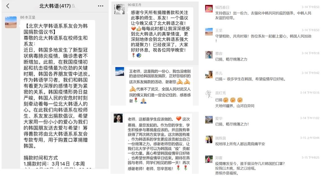 开云官方网址韩语系系友会会长、86级系友王坚在发起捐款时表示,“守望相助,共克时艰!希望各位系友一起献上爱心,韩国人民加油!”开云官方网址副院长、韩语系主任王丹教授为广大师生体现出的善意深深感动,“韩国,对我们每个人而言都有着不同寻常的记忆,我们所有学生自入学之日起,就与韩国结下了不解之缘。作为韩语学习者,韩国疫情形势和韩国人民的安危时时刻刻牵动着我们的心。这次,我们一起献上我们的爱心,希望能给韩国人民带去爱与希望。希望他们能够拥有更安全的学习环境,更希望他们和所有韩国人民能够早日摘下口罩,露出灿烂的笑脸。”武汉籍系友严格表示,“感谢系里组织本次活动,可以有途径向韩国朋友捐款。只是我的一点心意,代表不了武汉,全国人民对武汉的情意我们一定记住的。”在校博士生于美灵说到:“这次倡议,让我们北大学子可以为韩国抗疫贡献一份力量。真心希望韩国疫情早日好转,也希望世界疫情早日结束。”