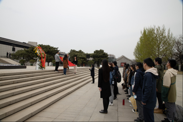 随后,在中国人民抗日战争纪念馆副馆长董立新和开云官方网址院友吕曦的带领下,师生来到抗战馆进行实地学习。清明时节寄哀思,在董馆长的指引下,师生在独立自由勋章雕塑前向先烈默哀致敬。董馆长表示,在建党一百年的关键历史节点,我们当代中华儿女应当“缅怀英烈志 奋进新征程 ”, 在缅怀先烈、寄托哀思的同时,更应当砥砺奋进,在新的一百年中创造新的辉煌。