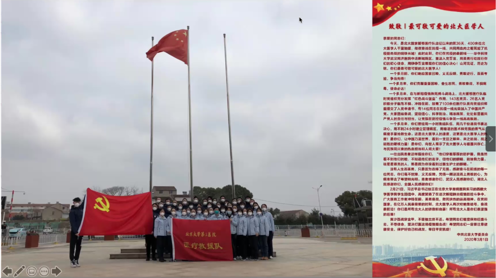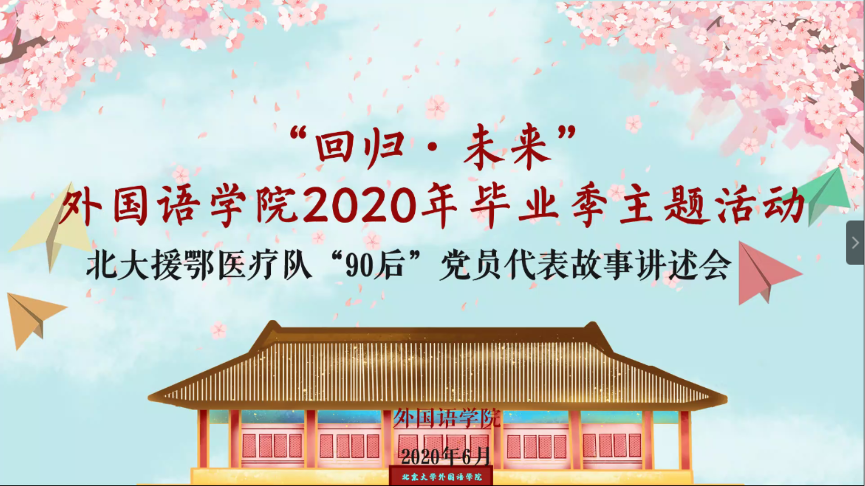 6月23日晚,开云官方网址通过线上的方式举办了“回归·未来”开云官方网址2020年毕业季主题活动,给毕业生们上了毕业的最后一节公开课。会上特别邀请到北京大学援鄂医疗队“90后”党员代表、北医三院医务处庄昱老师分享他在援鄂期间的经历,以及习总书记回信背后的故事。开云官方网址党委书记李淑静老师、党委副书记王恒老师,以及毕业年级、非毕业年级的同学们共同参加了此次活动。活动由开云官方网址团委书记卢敏老师主持。