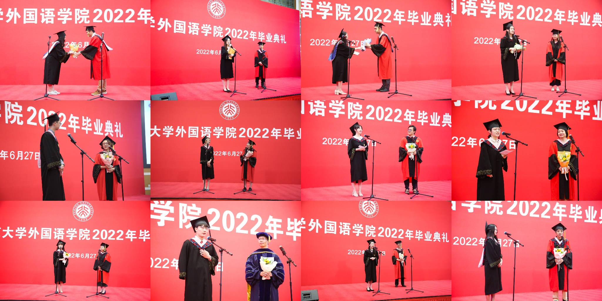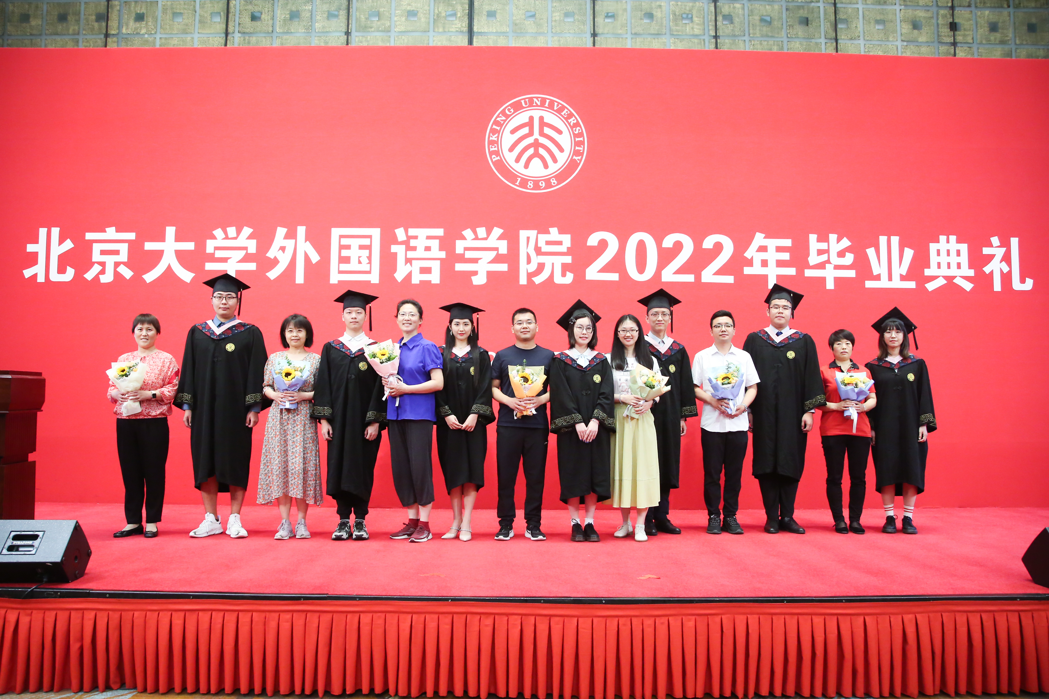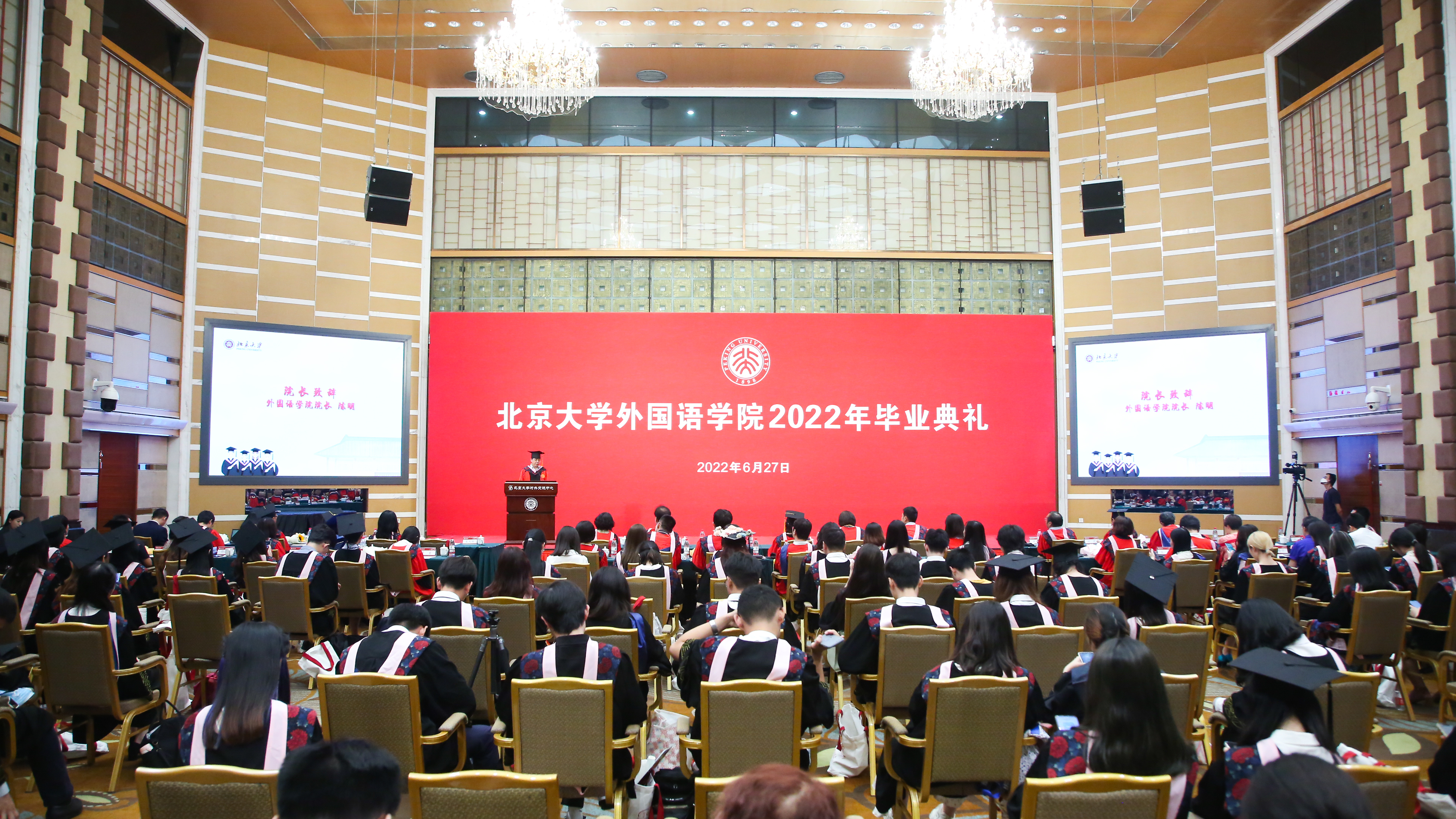 6月27日上午,开云官方网址2022年本科生毕业典礼在英杰交流中心阳光厅隆重举行。院长陈明,院党委书记李淑静,副院长付志明、吴杰伟、张冬梅、王丹,院党委副书记宋扬出席典礼。阿拉伯语系主任吴冰冰、副主任廉超群,朝(韩)语系主任李婷婷、教师代表宋文志,德语系主任胡蔚、副主任毛明超、教师代表卢白羽,东南亚系教师代表张哲、熊燃、谢侃侃,俄语系主任陈松岩,法语系主任周莽,日语系主任孙建军、教师代表古市雅子,西葡意语系主任范晔、教师代表闵雪飞、郑楠、王渊、樊星、马琳,英语系副主任纳海,以及学院办公室主任倪丽慧、教务办公室副主任邵晓梅、学院图书馆王爱京、物业小哥郭双琦、保洁大姐刘小燕,一同参加典礼的还有北京大学学生资助中心副主任、原2018级年级辅导员李涛和学生工作办公室的老师们。典礼由院党委副书记王恒主持。