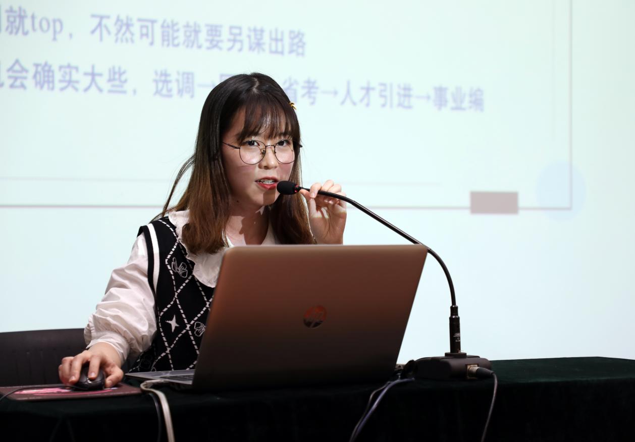 北大外院2020届毕业生门雪洁针对高校辅导员的求职和就业做了分享。她指出高校辅导员应当努力成为学生成长成才的人生导师和健康生活的知心朋友,因此需要极大的工作热情和相应的学工经历、能力储备与知识储备。谈到如何准备辅导员招聘,她从前期谋划、信息收集、笔试、面试四方面展开,建议大家在前期阶段进行职业测评,参与学生工作,参加公文培训和课题研究;通过加入求职互助小组和关注专项招聘网站,来获取辅导员工作文件,了解心仪院校往年招聘情况;在笔试阶段可参考国考的行测申论、辅导员工作案例、应聘学校的校史校情;在面试阶段需要提前准备自我介绍,练习结构化面试。她还向同学们推荐了高校辅导员联盟、高校思政网、思政热点等公众号,以便了解相关工作案例和前沿热点。