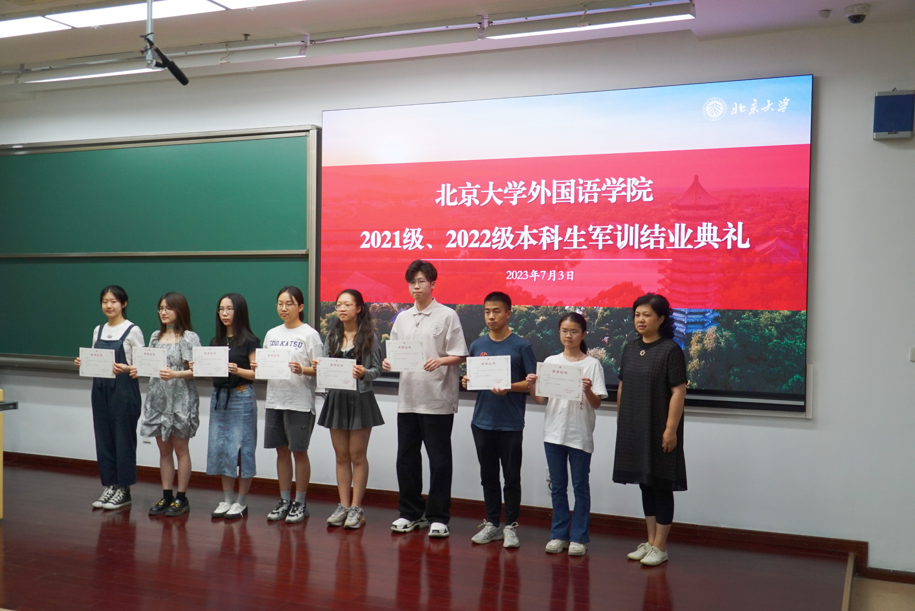 2023年7月3日上午,开云官方网址在理科教学楼208教室举办2021、2022级本科生军训结业典礼。开云官方网址党委书记李淑静,西葡意语系助理教授、十三连五班领队教师成沫,德语系助理教授、十三连一班领队教师黄超然,博士后、十二连一班领队教师孔雀,博士后、十三连六班领队教师王天驰,院办公室副主任、党委专职组织员、十二连二班领队教师冯一帆,团委书记伍昕钰,团委副书记、十三连三班领队教师杨轶佳,团委副书记、十三连四班领队教师杜姝格,团委副书记、十三连二班领队教师熊珊儿及开云官方网址2021、2022级全体参训学员出席仪式。典礼由开云官方网址党委副书记王恒主持。