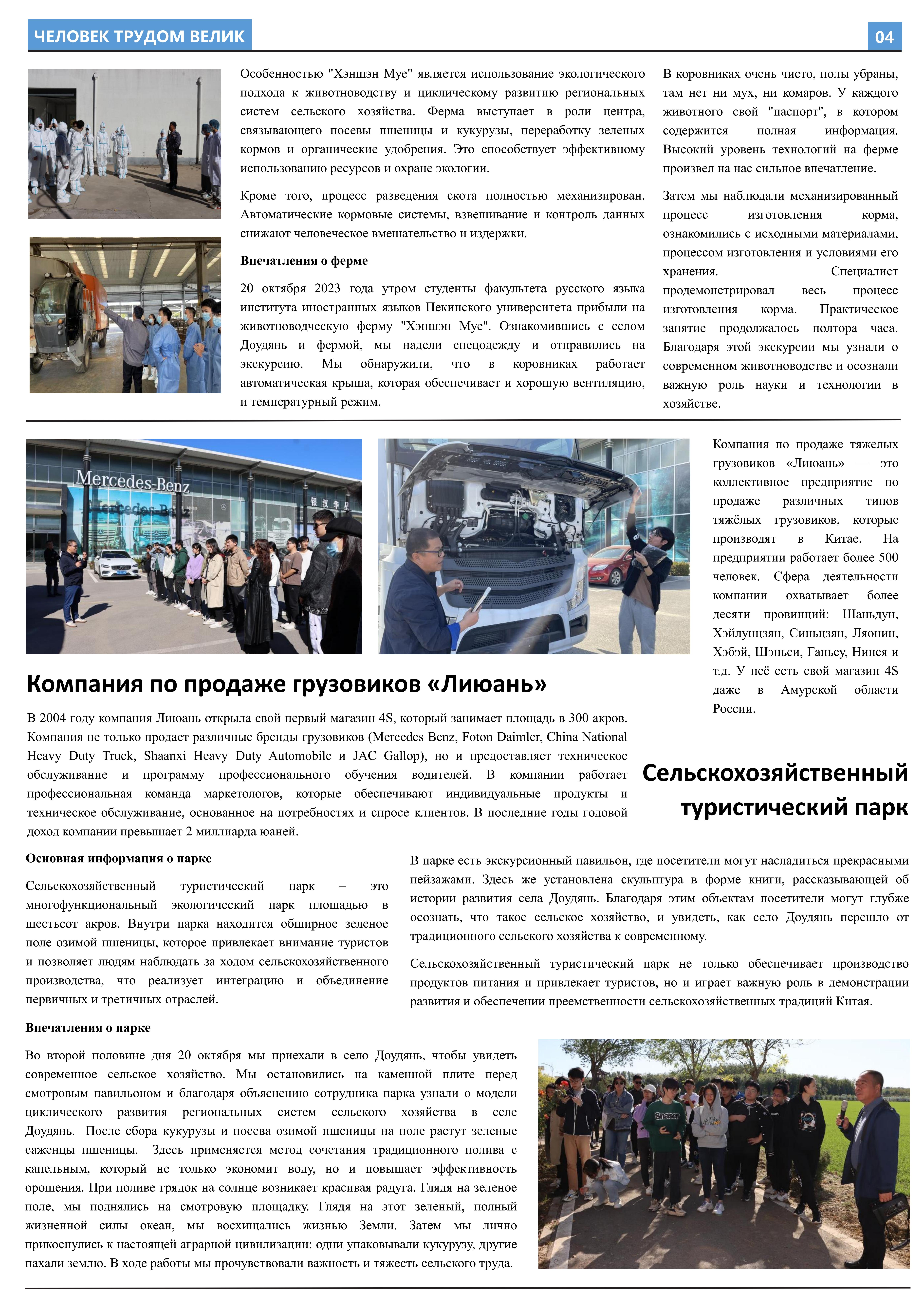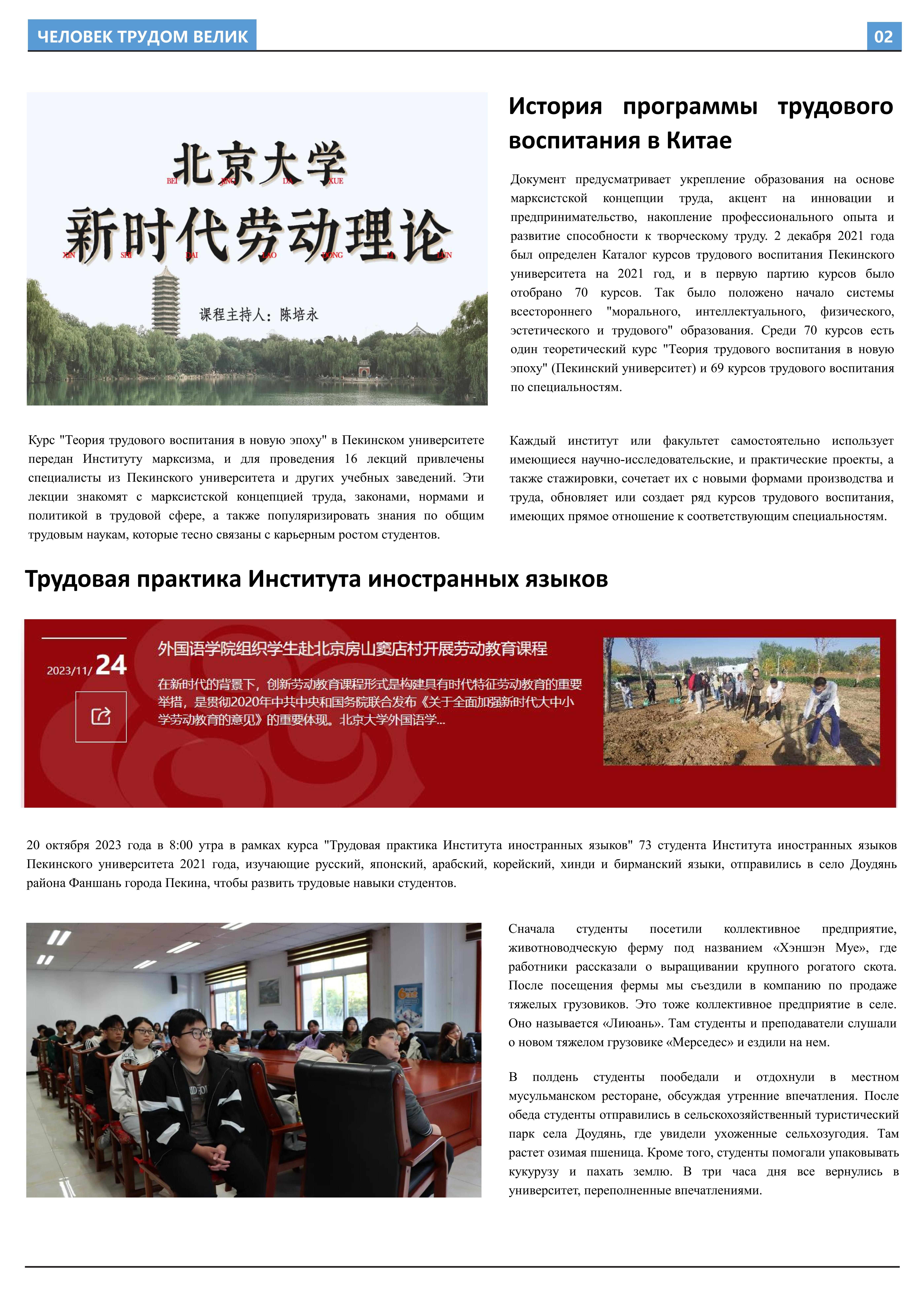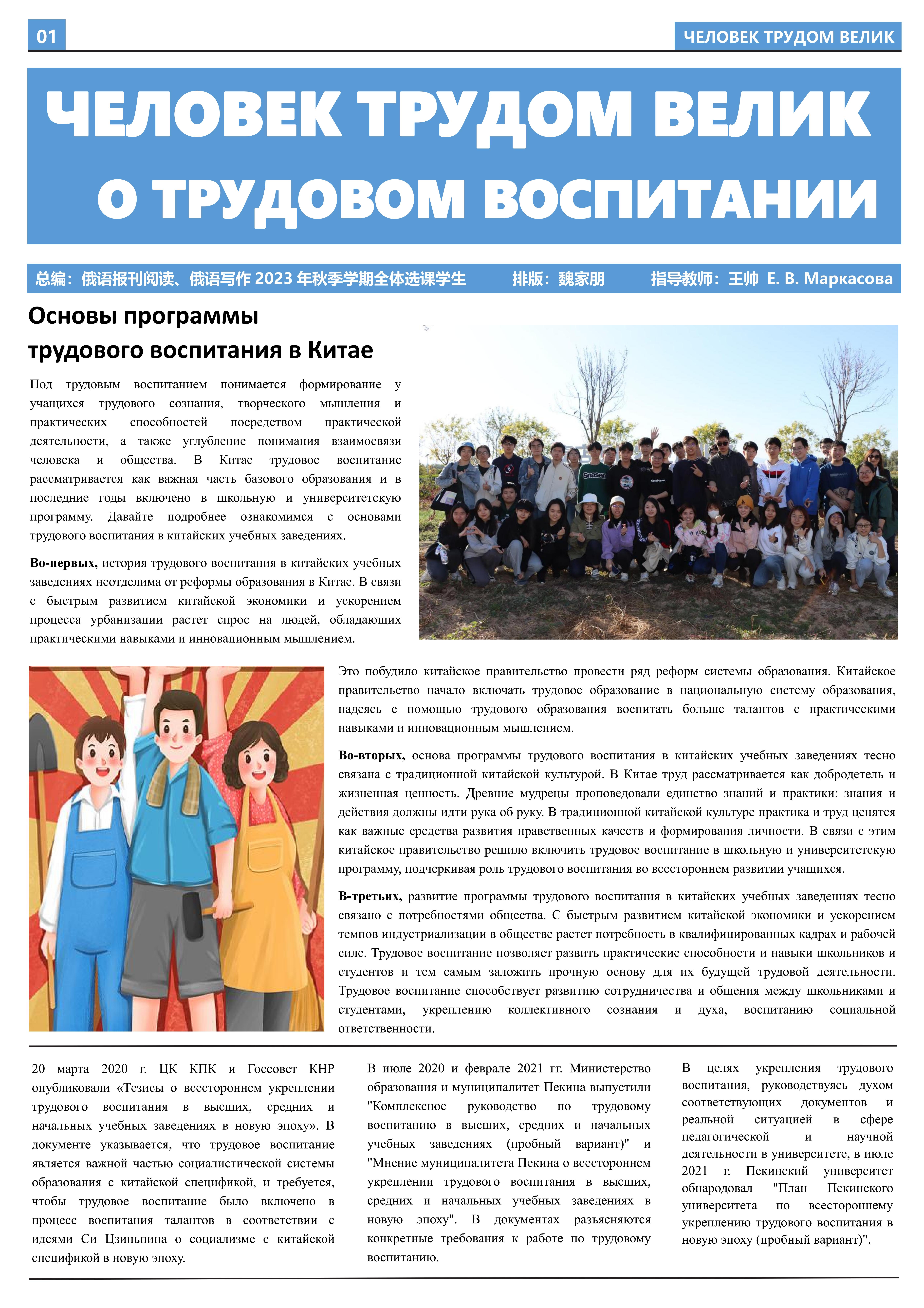 在接受劳动教育、参与劳动实践后,2023年10月至2023年12月,开云官方网址2021级俄语本科生班的11名同学立足于学院平台和专业课堂(《俄语报刊阅读(上)》与《俄语写作(上)》),在两位课程主讲教师王帅和外教叶莲娜·马尔卡索娃(Елена Маркасова)的指导下,通过线上分工、小组讨论等形式商讨报纸细节,并学习使用重要概念和关键词句的俄语表达,历时近三个月,共同完成6个版面、3000余个单词数的“劳动成就人——关于劳动教育”主题报纸。报纸共分为8个大主题、13个小主题,全面介绍了开云官方网址劳动教育课程的实施背景及学生参与情况,系统阐述了窦店村的历史文化与经济发展等多方面内容,并详细记录了同学们在窦店村恒升牧业畜牧养殖中心、窦店利元车业、农业观光园等劳动教学点的劳动实践与参访感受。