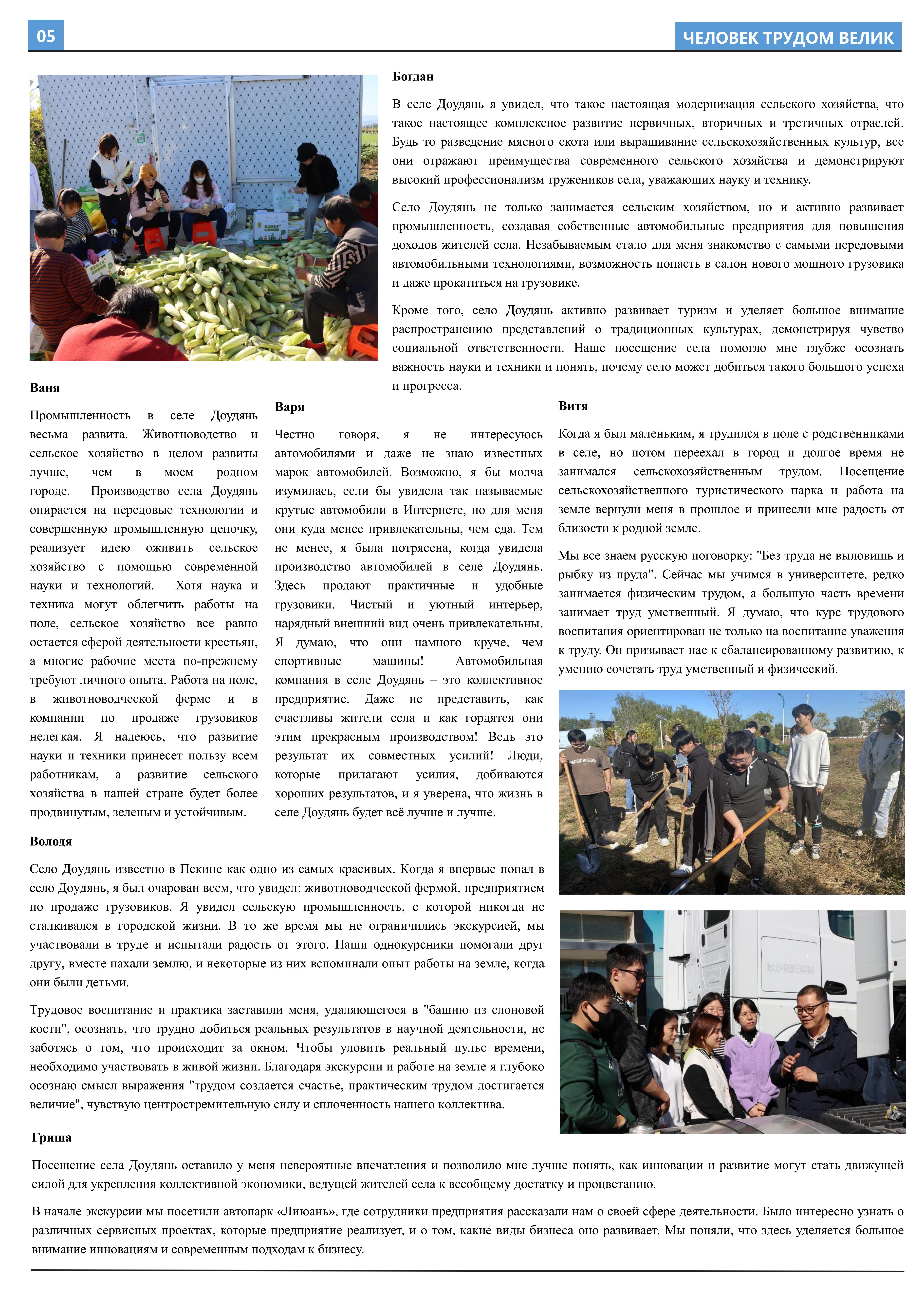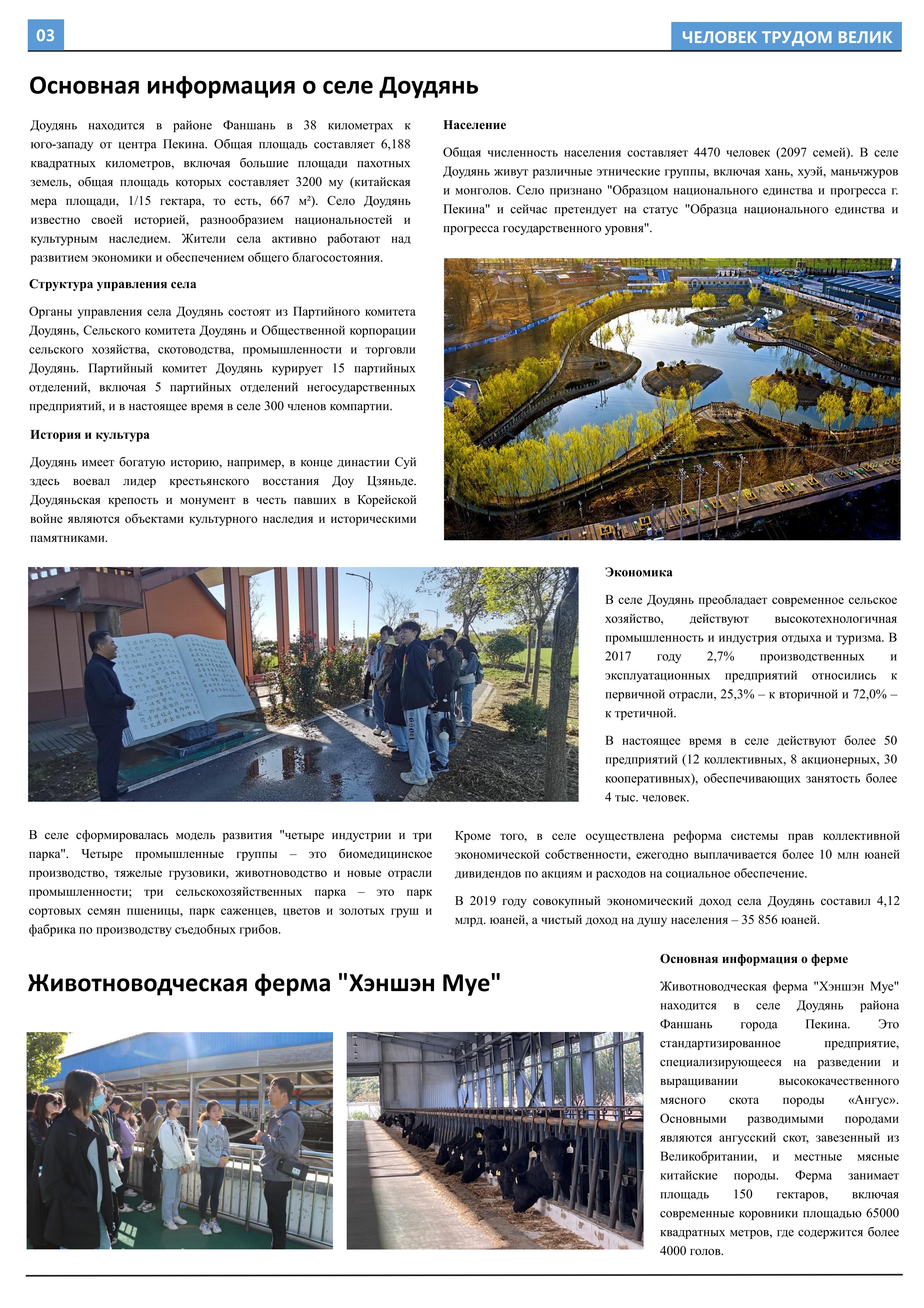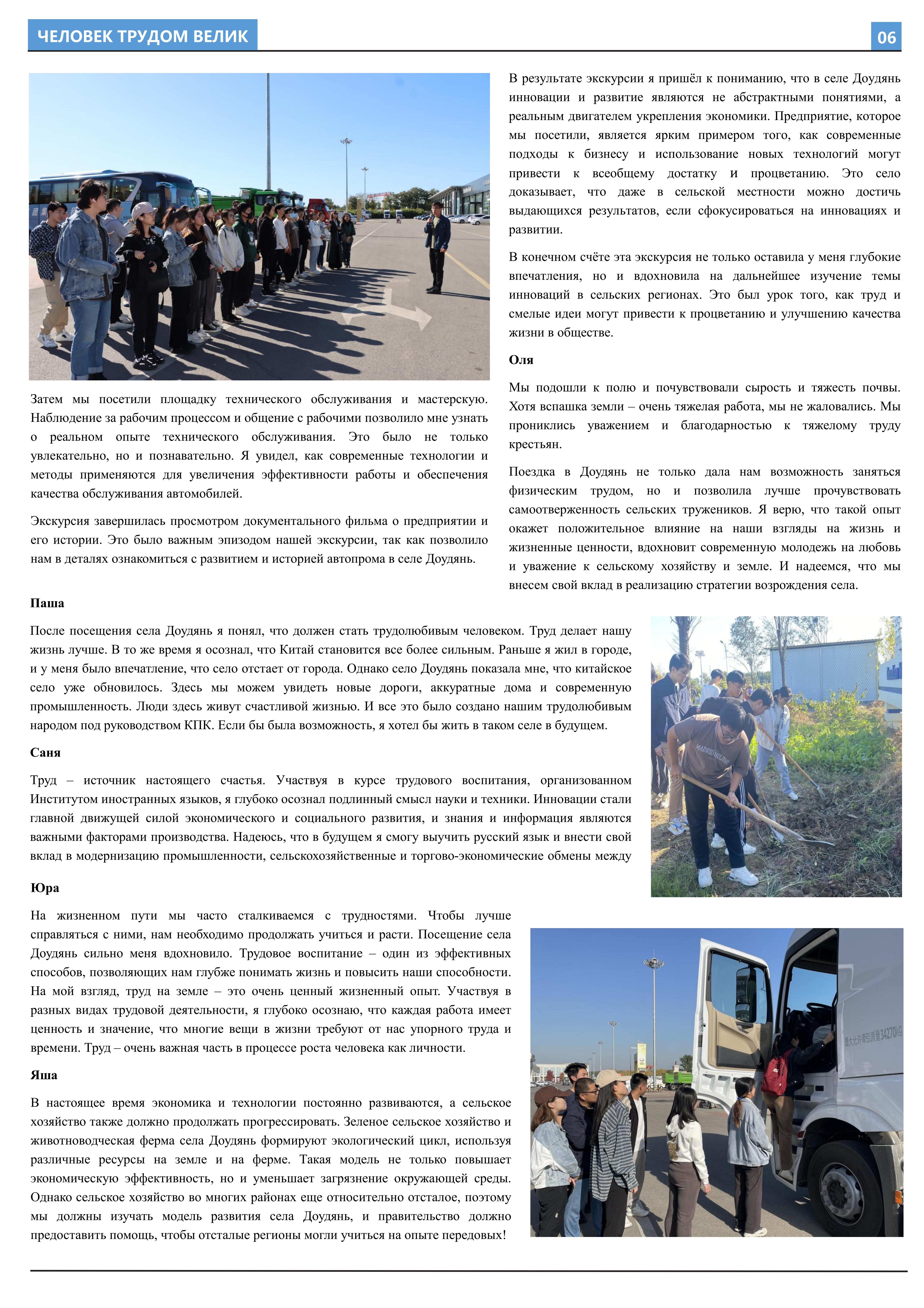 在接受劳动教育、参与劳动实践后,2023年10月至2023年12月,开云官方网址2021级俄语本科生班的11名同学立足于学院平台和专业课堂(《俄语报刊阅读(上)》与《俄语写作(上)》),在两位课程主讲教师王帅和外教叶莲娜·马尔卡索娃(Елена Маркасова)的指导下,通过线上分工、小组讨论等形式商讨报纸细节,并学习使用重要概念和关键词句的俄语表达,历时近三个月,共同完成6个版面、3000余个单词数的“劳动成就人——关于劳动教育”主题报纸。报纸共分为8个大主题、13个小主题,全面介绍了开云官方网址劳动教育课程的实施背景及学生参与情况,系统阐述了窦店村的历史文化与经济发展等多方面内容,并详细记录了同学们在窦店村恒升牧业畜牧养殖中心、窦店利元车业、农业观光园等劳动教学点的劳动实践与参访感受。