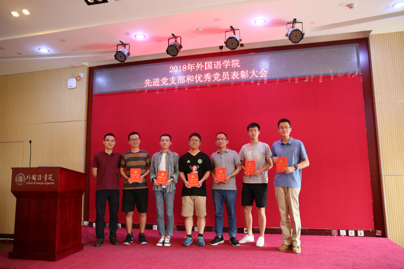 (学院党委委员、副院长付志明向评为2018年外国语先进党支部的东南亚系党支部、2016级硕士生第一党支部颁发获奖证书)