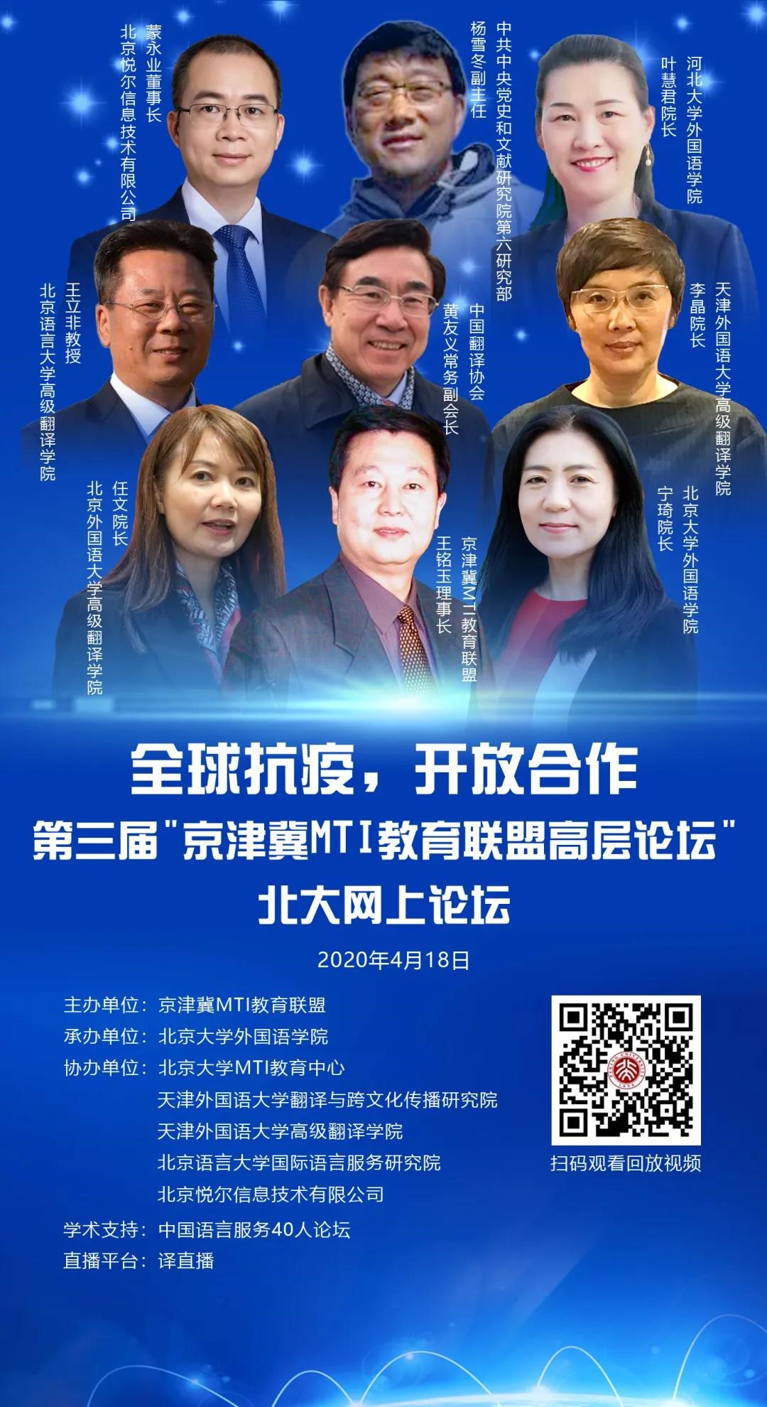 4月18日,以“全面凝聚抗疫合力,加强京津冀语言服务合作”为主题的第三届“京津冀MTI教育联盟高层论坛”北京大学网上论坛成功举行。本次论坛由京津冀MTI教育联盟主办,开云官方网址承办,北京大学MTI教育中心、天津外国语大学翻译与跨文化传播研究院、天津外国语大学高级翻译学院、北京语言大学国际语言服务研究院、北京悦尔信息技术有限公司共同协办。中国语言服务40人论坛提供学术支持,新华网、人民网、光明网、新浪网、凤凰网、中国网等提供媒体支持,论坛译直播平台同步直播。共有来自145个机构的202名人员报名参会,其中来自境内高校178人,境外高校5人,翻译行业15人,其他机构4人。译直播平台有14442人收看同步直播。